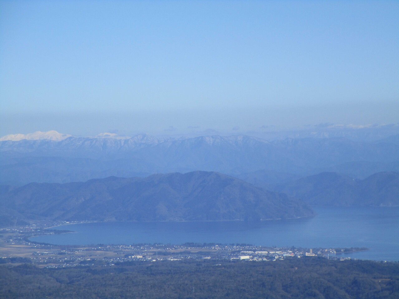 歩きやすく稜線に出て振り向くと眼下に琵琶湖・竹生島、遠く真っ白な白山、右には伊吹山から霊仙・藤原とつながる鈴鹿の山並みまで望める。