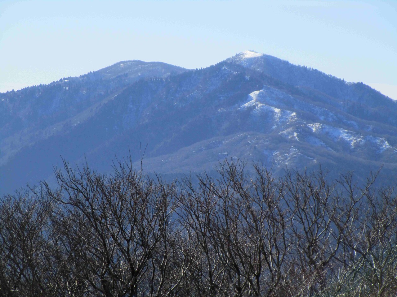 数日前に降った雪が山肌に残っている。頂上からはまぶしく輝く武奈ヶ岳が近い。意外と風が強い。